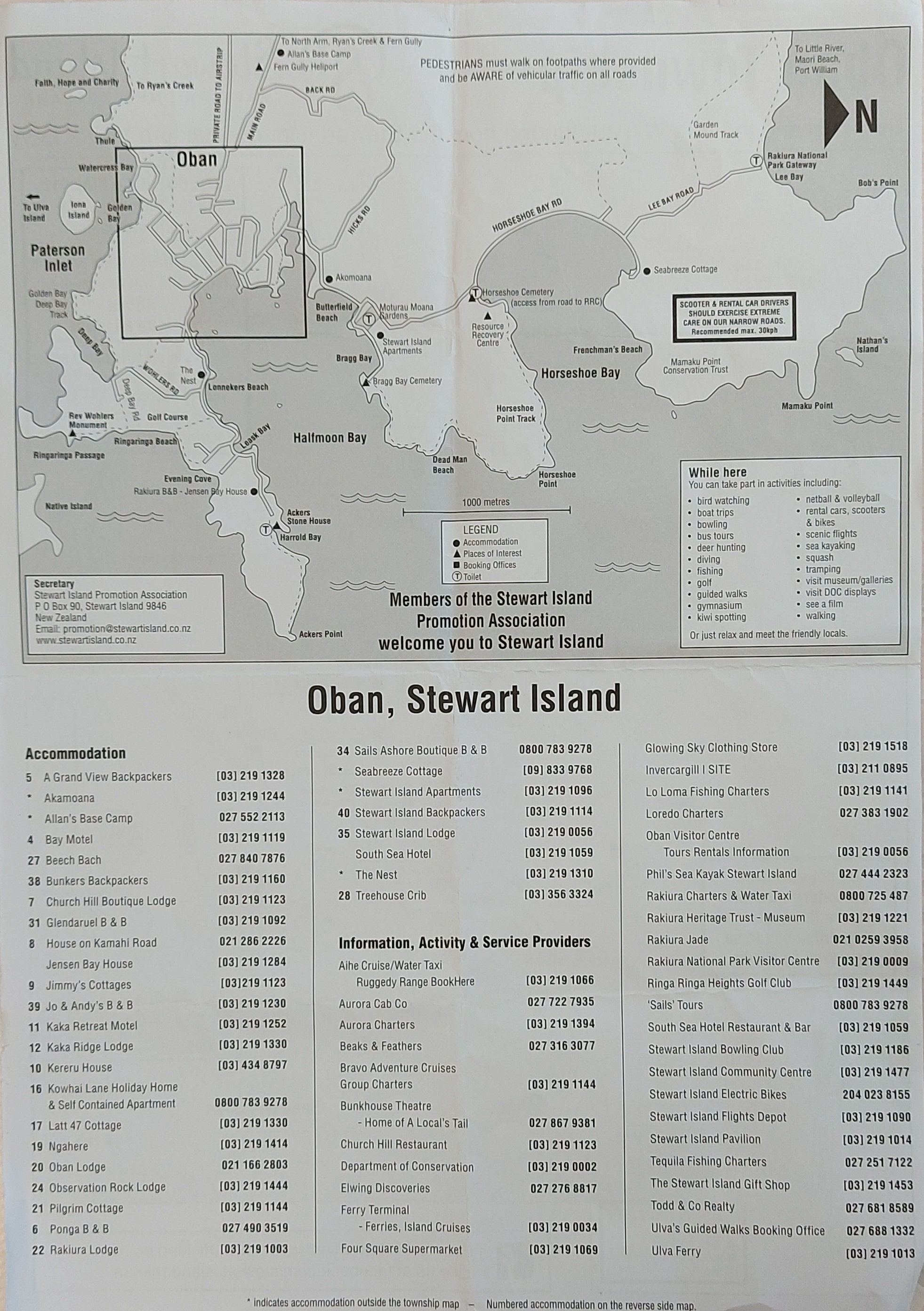From Invercargill it is a 27km taxi ride or bus ride to Bluff. “Catch-A-Bus South” operates a bus from Invercargill to Bluff twice daily. Then it is on to the ferry “Stewart Island Experience NZ” and after a one hour boat ride you will arrive at Oban, Stewart Island. The other option is a 20 minute flight from Invercargill to Oban.
