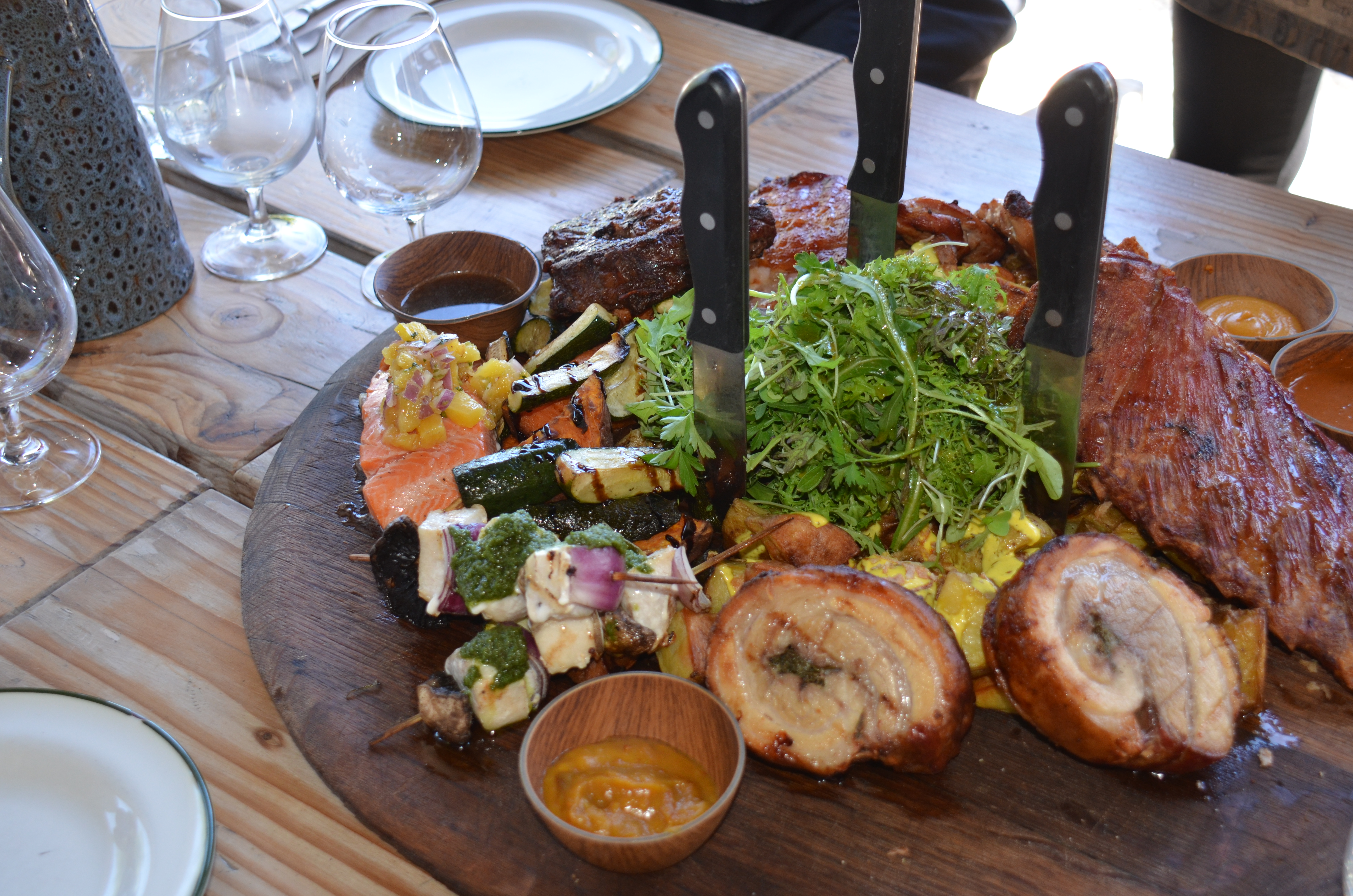 From Hawea we drove to Wanaka then via the west side of Lake Dunstan to Cromwell for lunch at Wild Earth Wines. We all shared the Stoaker banquet. Stoaker is a cooking system in a rustic wine barrel. The oak and steam create a unique flavour to the meat, smoky and delicious.