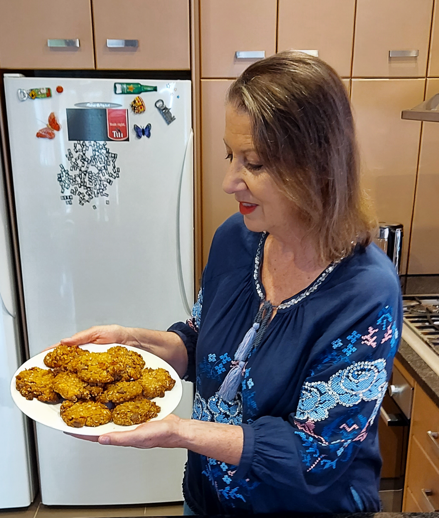 A twist on the classic ANZAC biscuit — chewy, golden and dotted with chocolate and dried apricots.