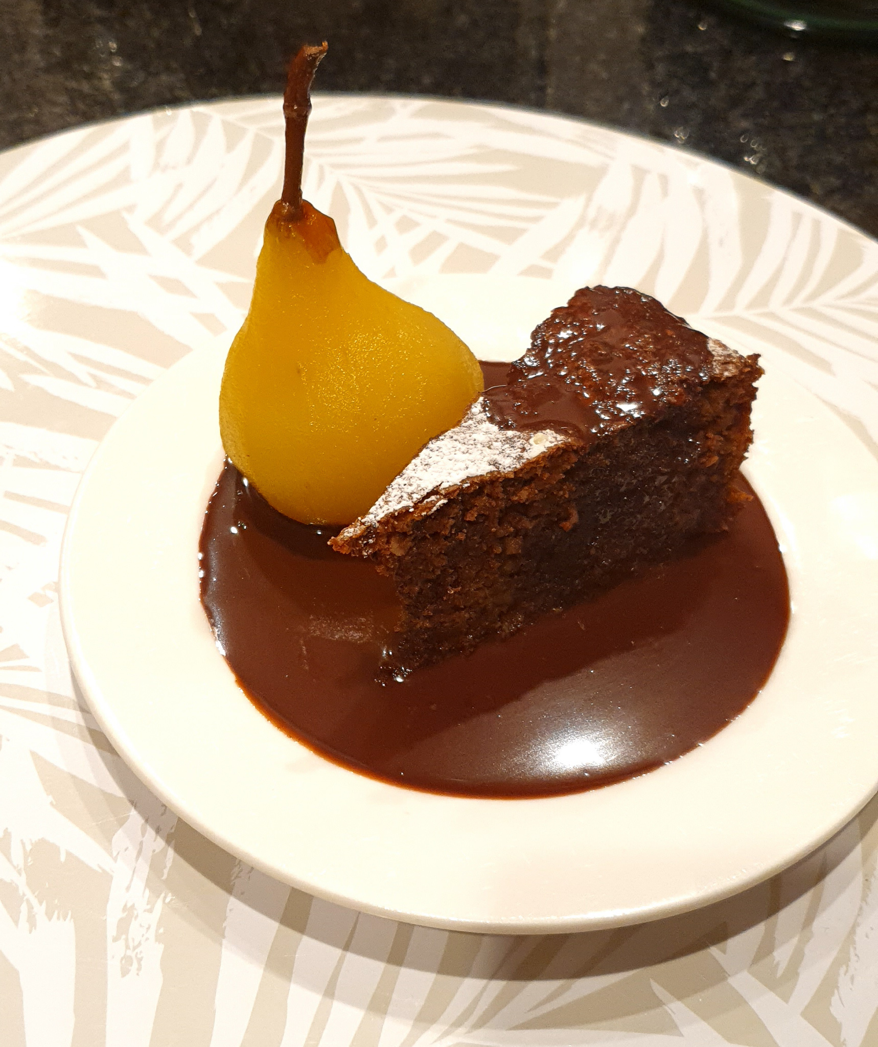 So I used the same recipe but substituted the red wine for white wine and it was lovely. It was served with a rich chocolate sauce and a slice of decadent chocolate cake. See the chocolate cake recipe I used, Two Nuts Chocolate Torte, here.