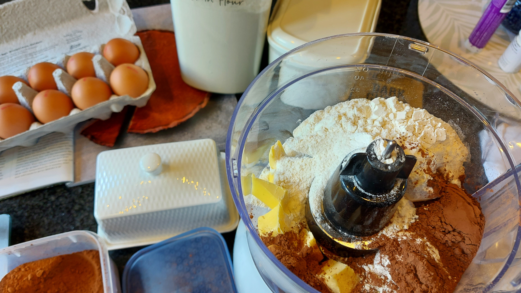 - Add flour, cocoa powder, and baking powder. Lightly mix, then tip onto a bench and squash together. Lightly knead and shape into a round.