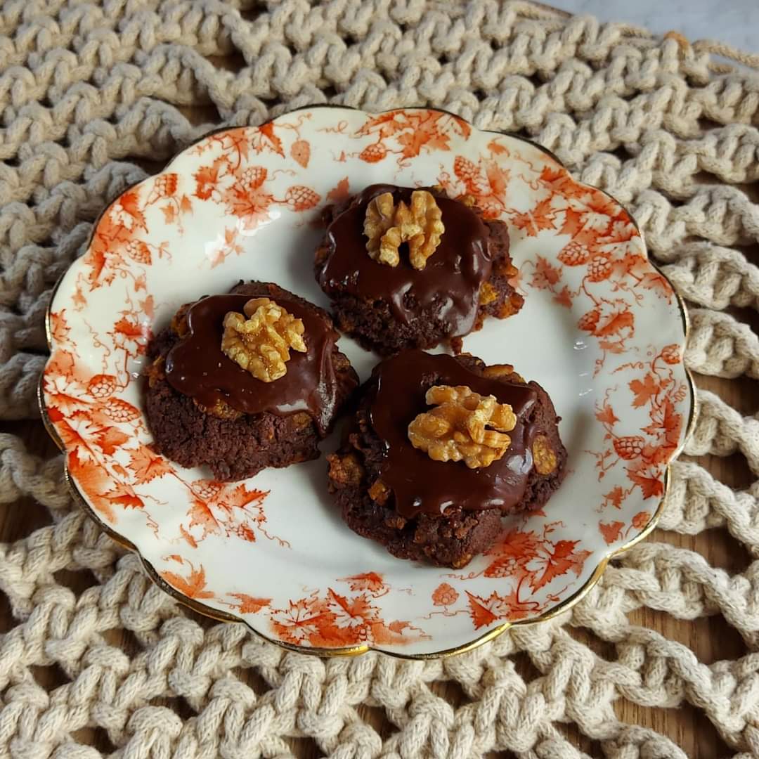 - Once completely cool, ice each biscuit with chocolate icing and top with a walnut half.