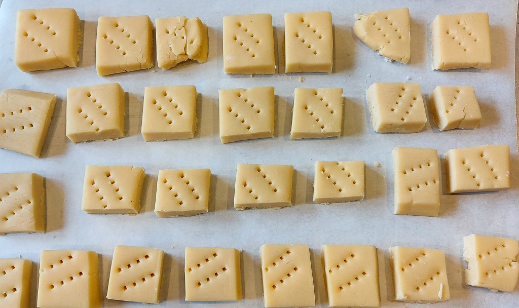 5. Roll & Shape: Roll the dough out to about 1/4 to 1/2 inch thick. Cut into squares or rectangles, then prick a few lines on top with a fork.