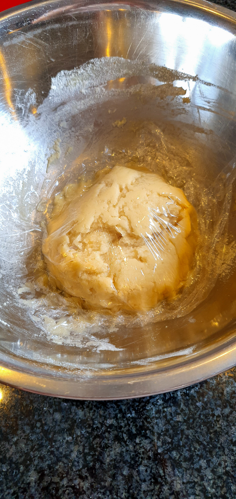 Measure your egg whites to the last drop and add the measured whites to the ground almond and icing sugar mix. Mix well so that you create a marzipan type almond paste. This takes a bit of effort but keep going until it is all thoroughly combined. Cover with plastic glad wrap, push down on all sides and set aside.