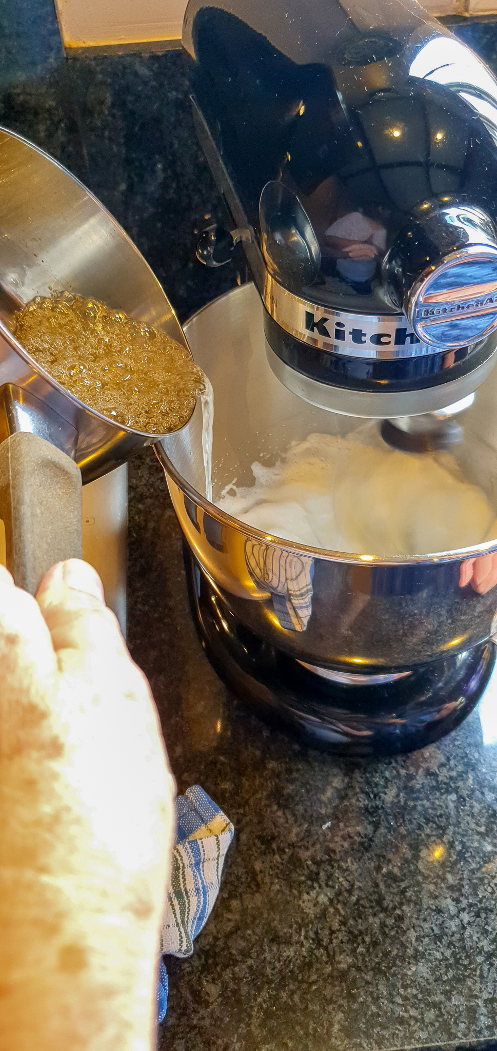 When the syrup reaches 120°C take it off the heat and pour down the side of the bowl containing the egg whites… all while the beater is running on high. Keep the beater running while pouring because we don’t want to cook the eggs yet. Be careful to pour this slowly down the side of the bowl so that it doesn’t splash. This is hot.