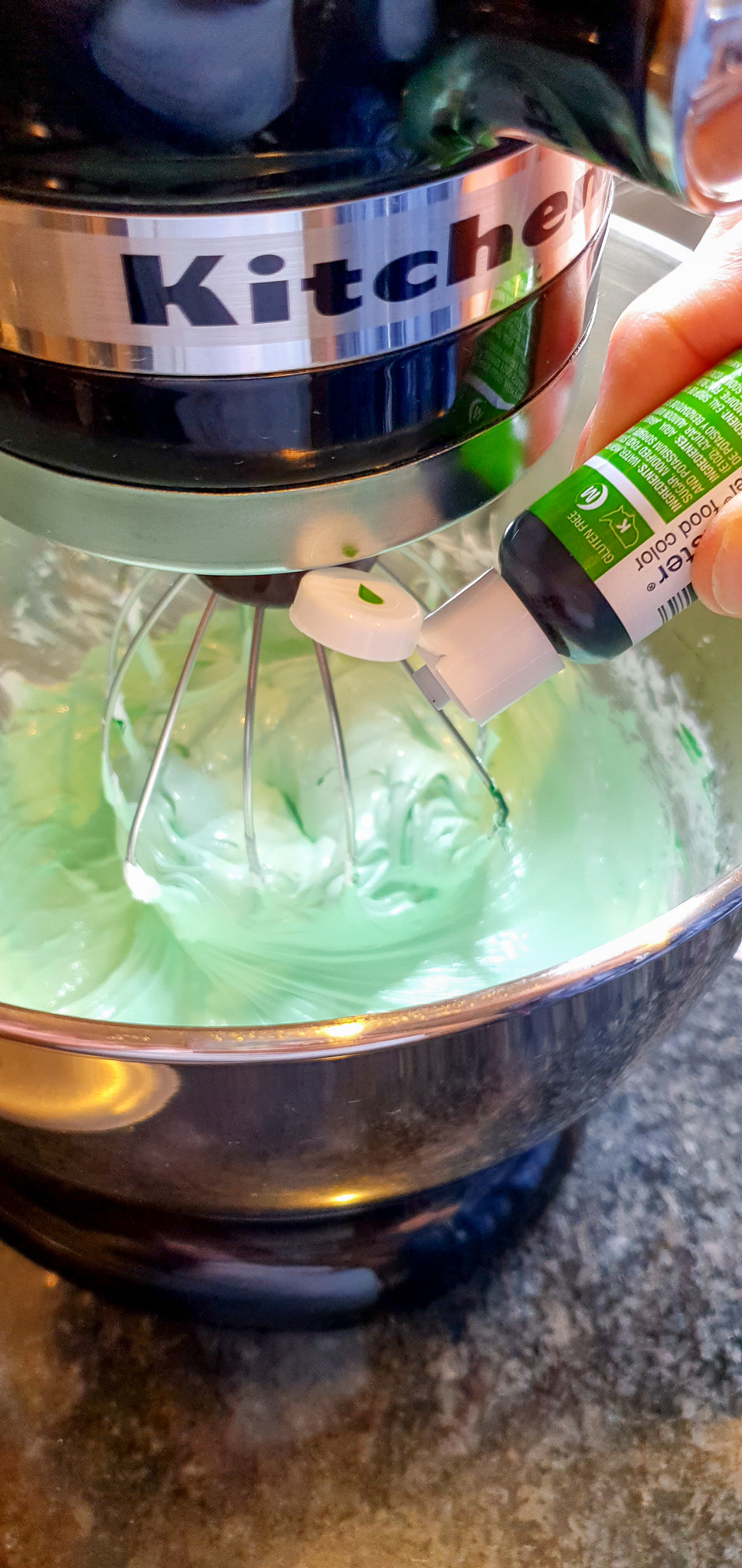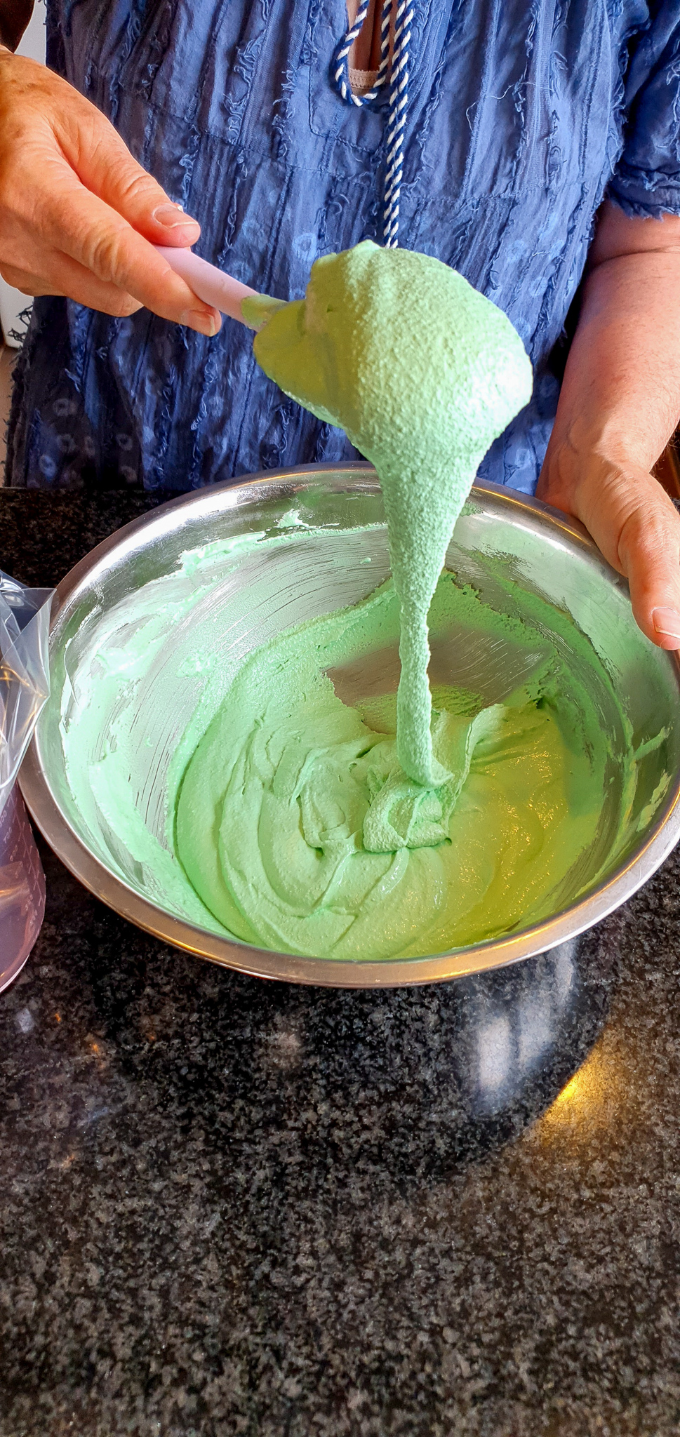 After 10 minutes the mixture will be shiny and glossy and this is now a beautiful Italian meringue. Now it is time to add the colour. I used several drops of green to get the colour I wanted. Stop the mixer to add the colour then mix again, repeat until you attain the correct shade you are after.