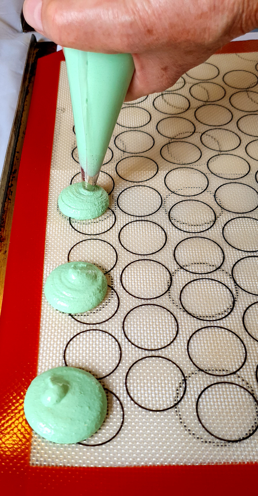 Pop into a piping bag and pipe little circles onto baking sheets using the macaron template placed under the baking sheet as a guide. Hold the piping bag vertically to get the perfect circular shape. When you reach the required size stop piping, hold, then create a circular flick to release- this will prevent peaks from being formed. Don’t forget to remove the templates from under the baking sheets or parchment paper before you bake.