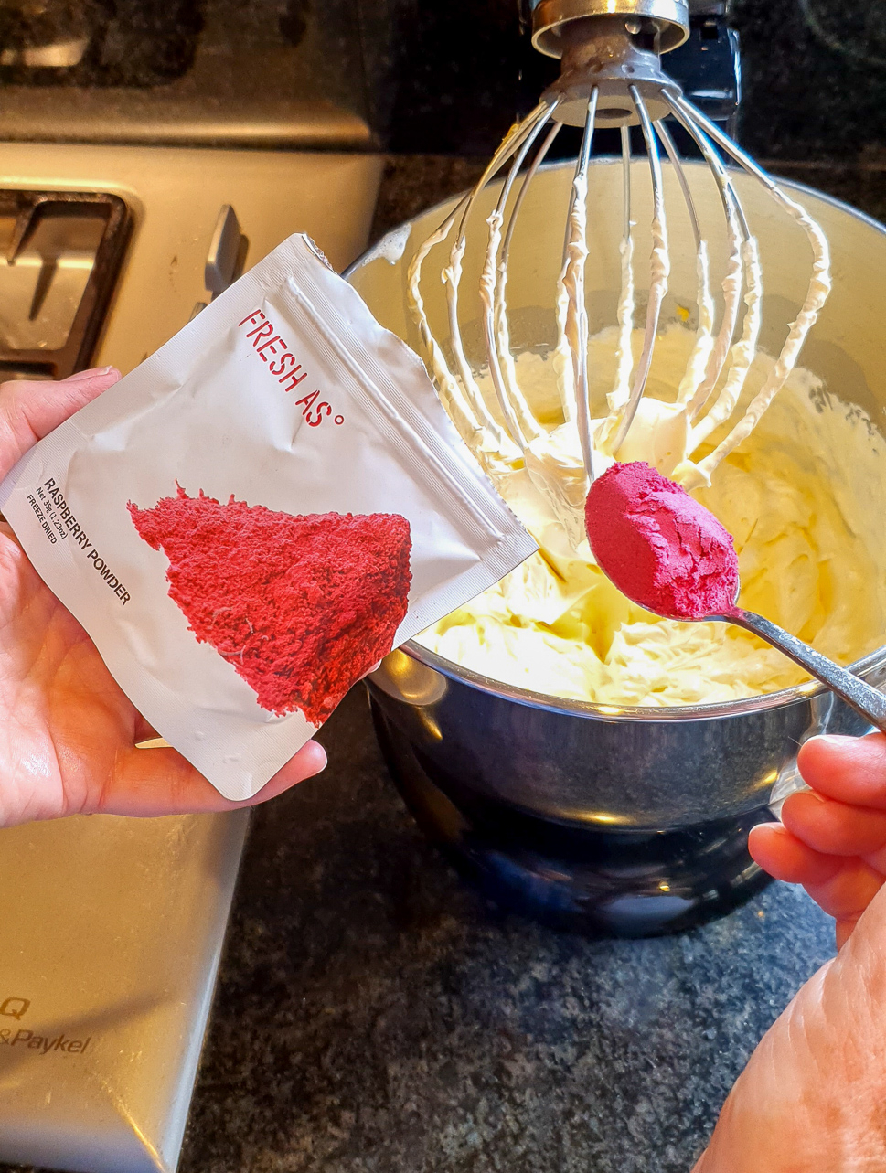 - Add 2 heaped teaspoons of Fresh As raspberry powder, add several drops of Chefmaster Liquid Gel Super Red, mix well. Taste as you go to check for the best flavour and adjust as required.