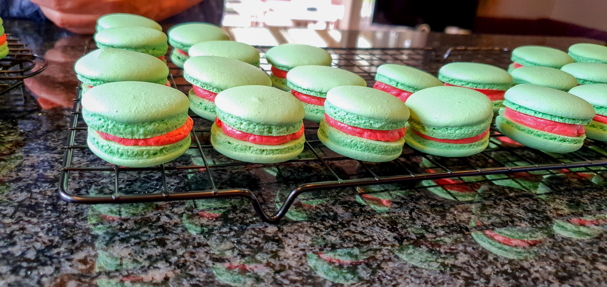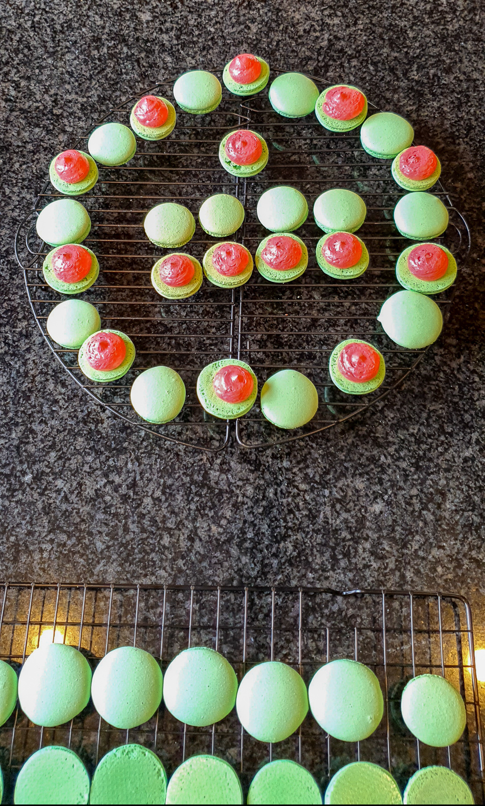 The shells are made using the Italian meringue method & the filling is a raspberry Swiss style butter cream.