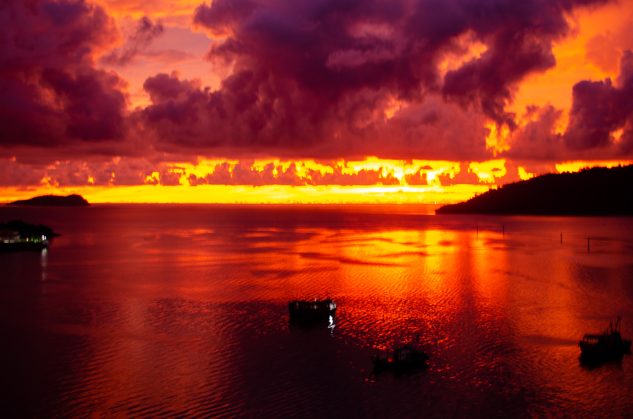 Then the sky went pink, gorgeous! Next it went red, wow so beautiful then… the whole world went blood-red. I’m talking the sky, the water, the island in the distance, the waterfront, the hand in front of my face… I had to ask Basker if he was seeing this too or had my eyes gone wonky? It was such a magical, breath-taking, unforgettable moment, and I can assure you that my photos or videos have not been enhanced. It was real.