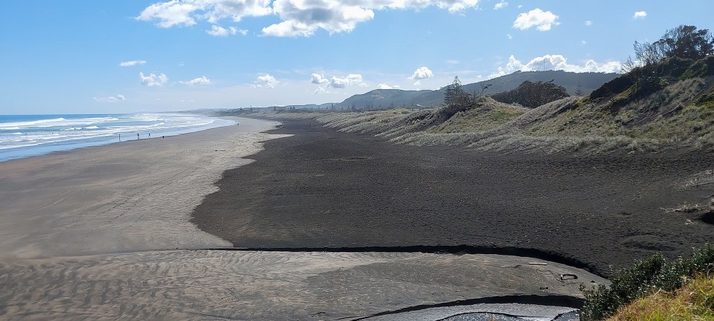 At Muriwai’s southern end, Otakamiro Point is the site of one of NZ’s few mainland gannet (takapu) breeding colonies. We think the gannets might be starting to arrive from Australia and surely the white-fronted terns would be here by now but unfortunately the track to the colony was closed today. Not sure why, but it could be because Muriwai was badly affected by Cyclone Gabrielle. Evidence of the devastation still abounds. See recent updates here.
