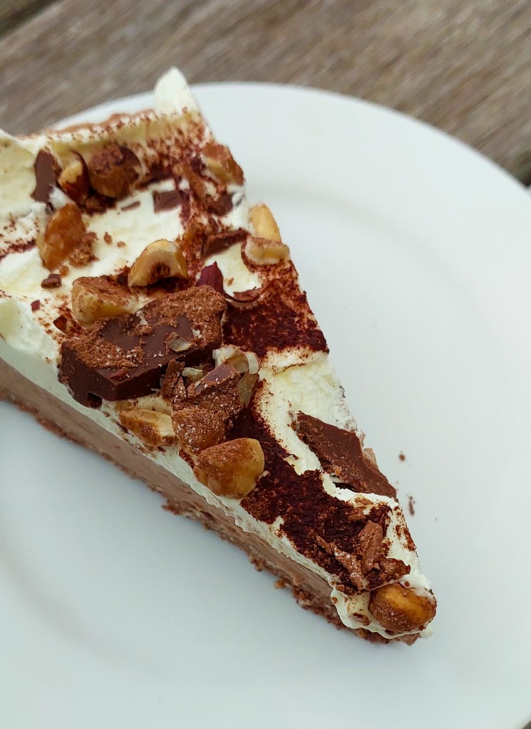 A no-bake cheesecake with a hazelnut and biscuit base, a smooth Nutella cream cheese filling, and a whipped cream topping finished with chocolate chunks and toasted nuts.