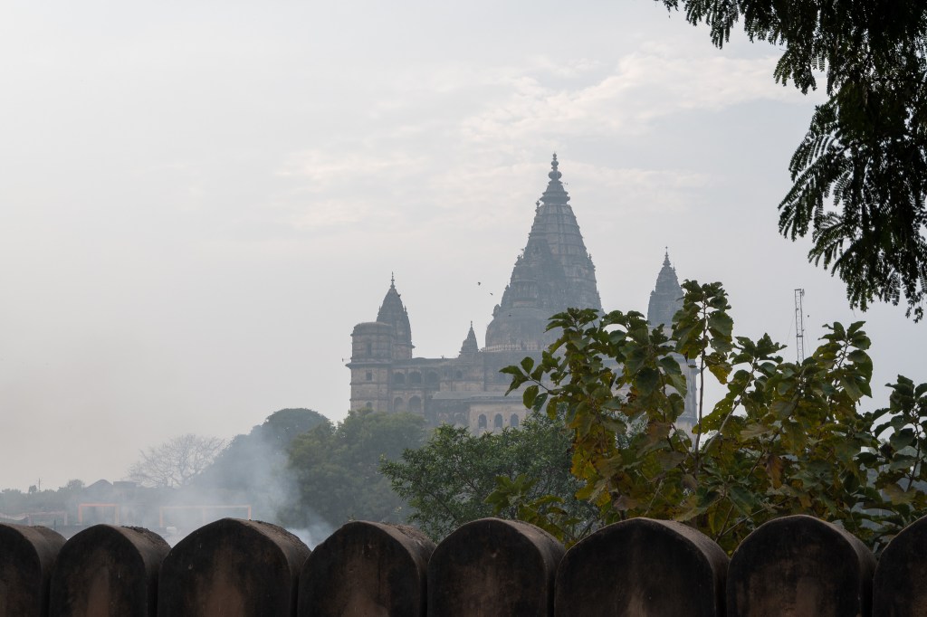 In the background, you can see the Orchha Chhatris, a group of 15 funerary monuments. These memorials honor the Bundela-Rajput kings and queens and are set along the banks of the Betwa River. They were built between the 16th and 18th centuries by the rulers of the time.