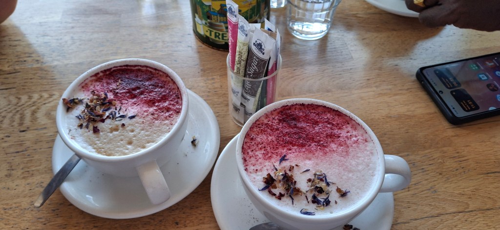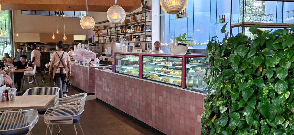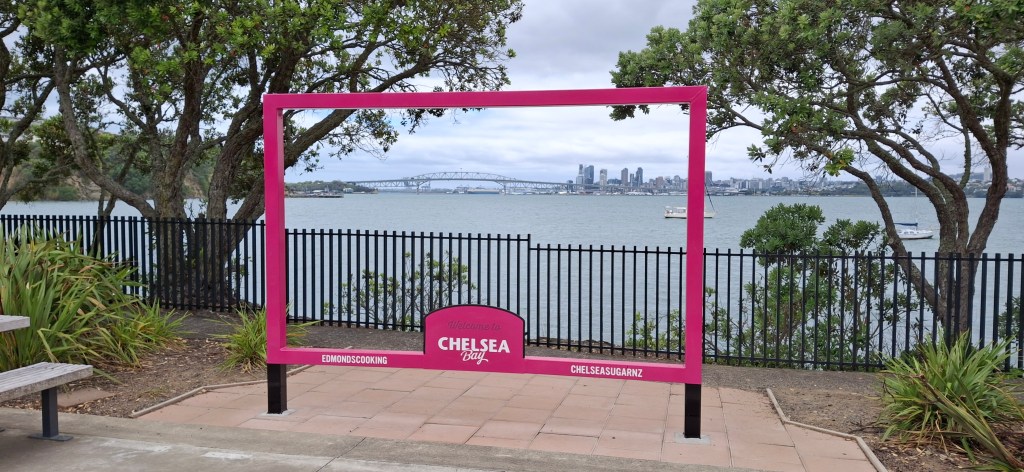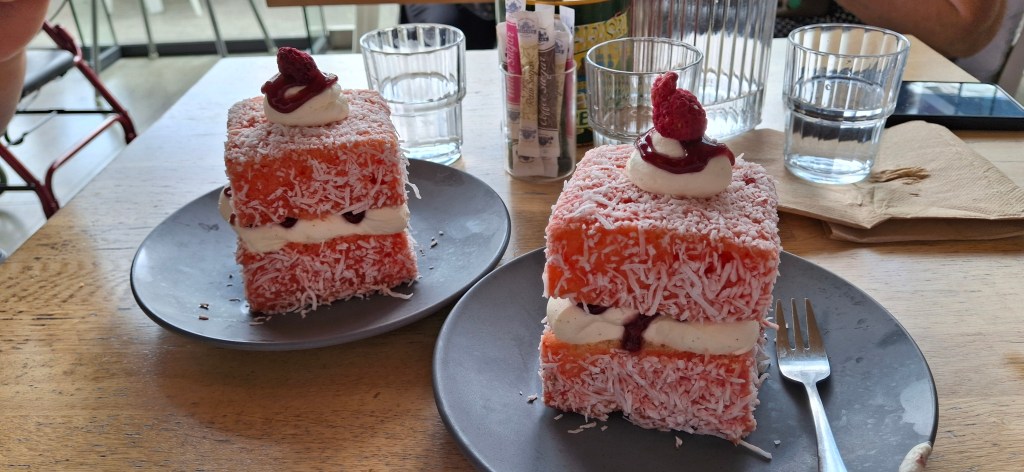 After our walk, we headed to the Chelsea Sugar Factory, 📍located at 100 Colonial Road, Birkenhead, Auckland, where we were lucky enough to walk-in and get a table at “Sugar Cafe”. It was a busy spot, especially with the school holidays in full swing, and while many Aucklanders are off enjoying the beaches and camping, it seems those sticking around the city are flocking to local restaurants and attractions. We started with rose lattes, then had a toasted chicken sandwich, followed by the real treat—raspberry lamingtons! These are the signature dessert at the café, and luckily, Nisha had spoken to the waitress as soon as we arrived and arranged to have two lamingtons put aside for us. When it came time for dessert, we found those in the cabinet were all sold out, luckily we got ours at just the right time!