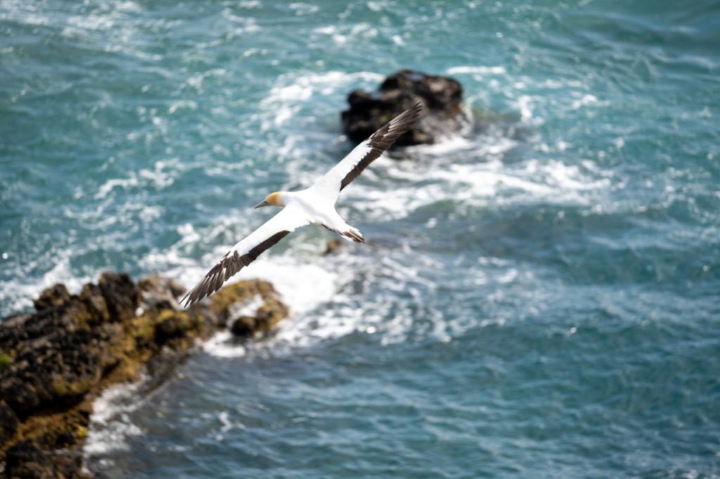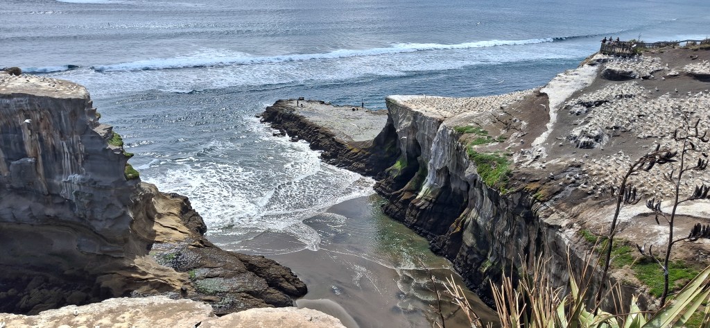 One of the best parts of Muriwai is the Gannet Colony, located on the southern end of the beach. It’s home to one of the few mainland gannet breeding sites in New Zealand. These birds come all the way from Australia, and it’s wonderful to watch them flying in and out, bringing food back to their chicks on the nests. It’s captivating— noisy, head-bobbing, bill scraping, chicks calling, feathers flying!
