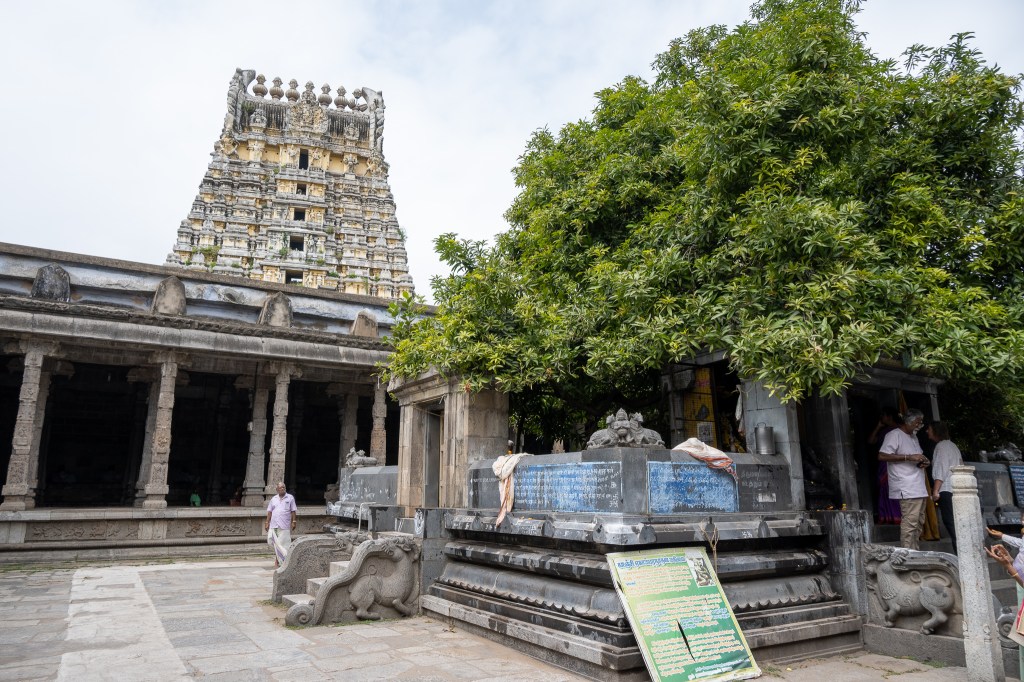 Our first stop in Kanchipuram was the Sri Ekambaranathar Temple. This temple is dedicated to Lord Shiva and has a huge 57-meter-high tower at the entrance. Inside, there’s a large courtyard with a 3,500-year-old mango tree, said to have four branches representing the four Vedas. It’s one of the largest temples in the city, and walking through it gives you a real sense of the history and size of Kanchipuram.
