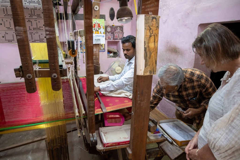 We also visited a local silk sari maker to learn more about the tradition of Kanchipuram silk. This part of the trip gave us a closer look at the craftsmanship involved in making these beautiful sarees. The designs are often passed down from generation to generation, and it’s clear that a lot of time and skill goes into each piece.