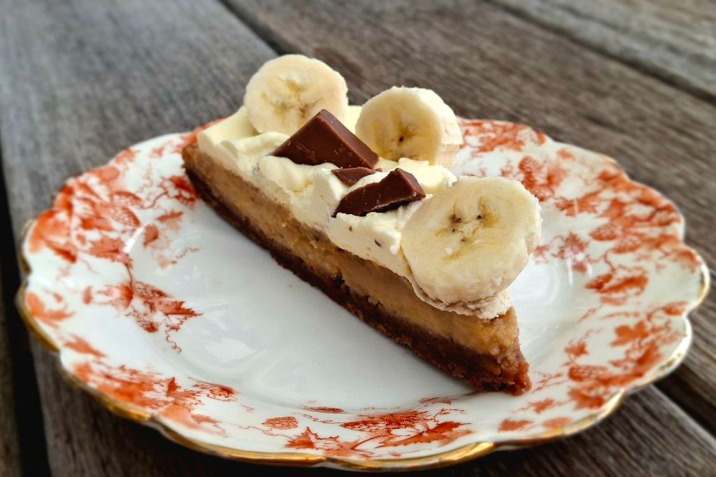 It couldn’t have been easier! Just mix the biscuit crumbs with butter and press into a cake tin. Cook the caramel banana filling on the stovetop, pour it over the base, and pop it in the oven. I baked mine for 18 minutes — a little more than the recipe said, probably because I used a slightly larger tin. Once it’s cooled, all that’s left is to add the toppings: dollops of whipped cream or crème fraîche, a few banana slices, and a sprinkle of dark chocolate. Very simple.