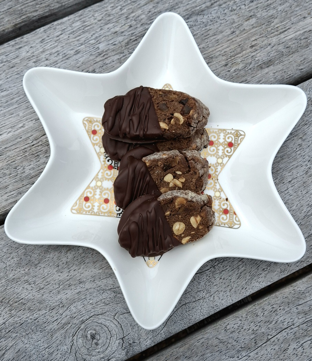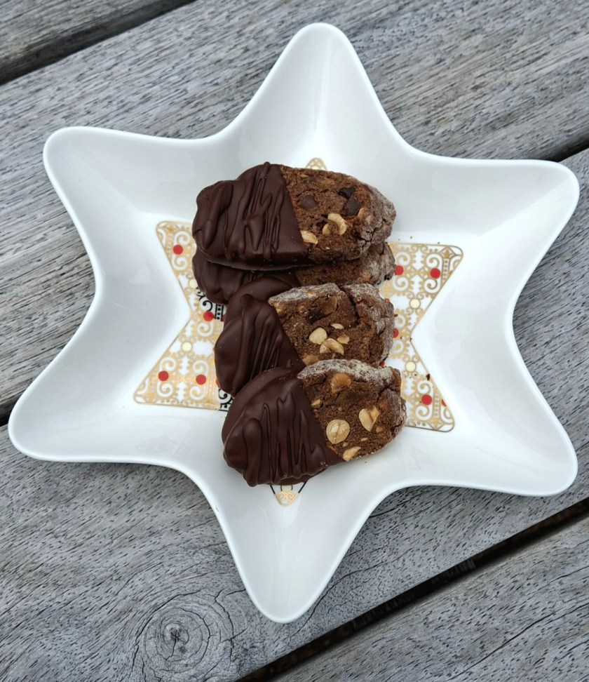Crisp hazelnut and ginger biscotti dipped in dark chocolate — perfect for Christmas gifting or with a good cup of tea.