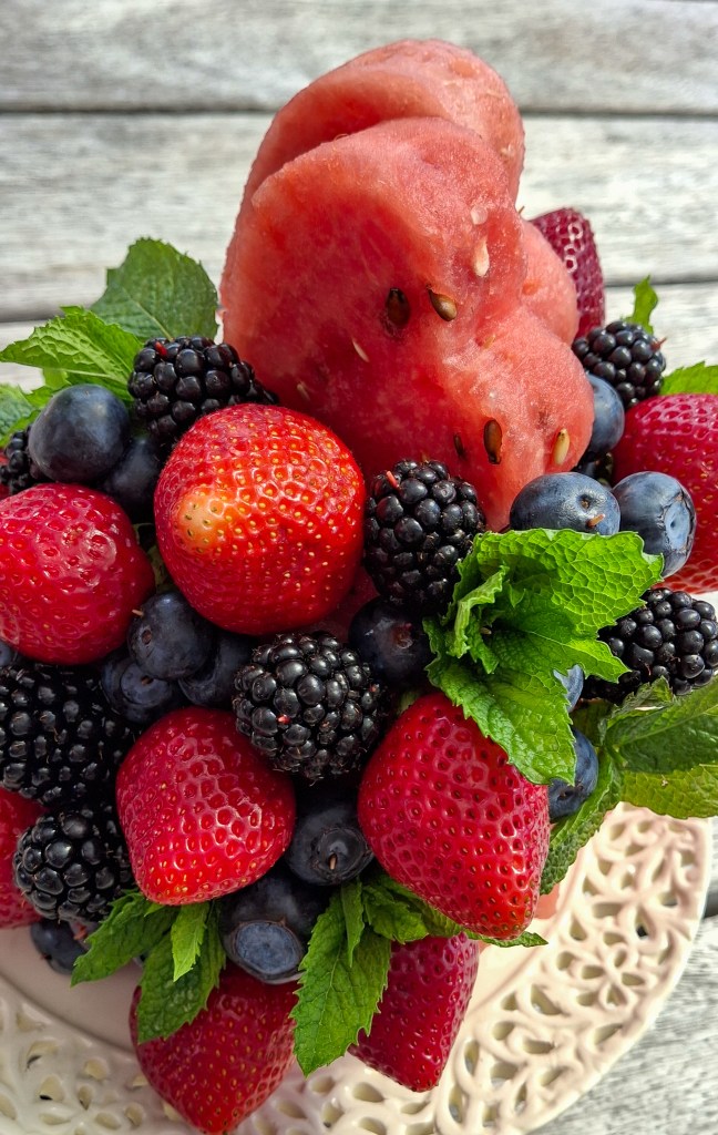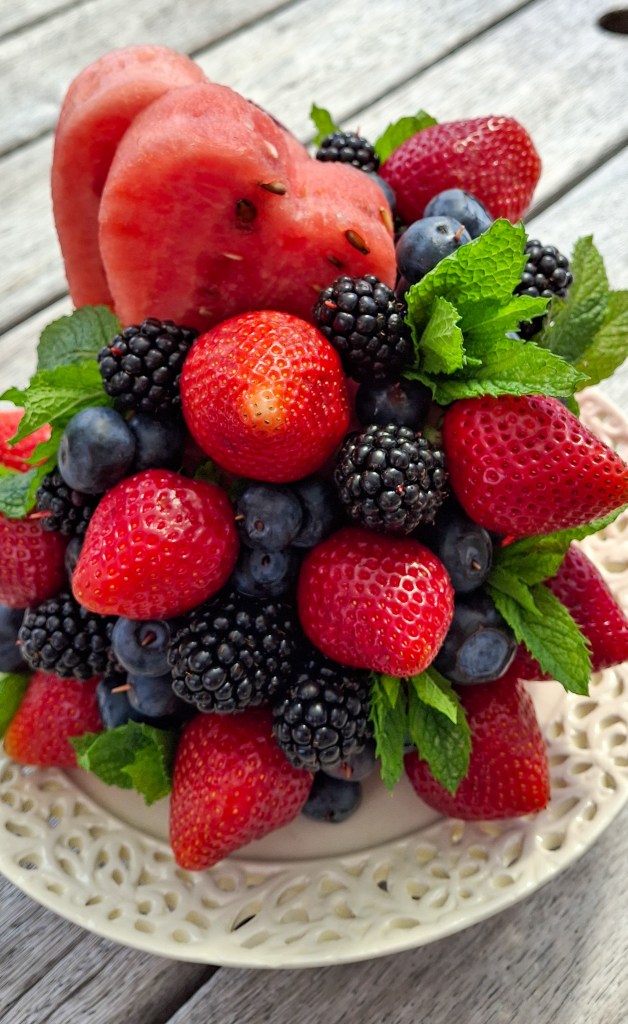 Poke strawberries, blackberries, and blueberries into the top and down the side of the watermelon using toothpicks. Add your heart-shaped cutouts too. Don’t worry about perfection—go wild! I just covered the front half, but you can cover the whole thing if you like. - Add the finishing touch